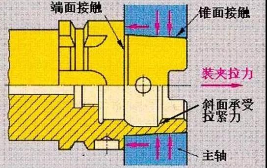HSK真空刀柄靠刀柄的彈性變形,不但刀柄的1:10錐面與機(jī)床主軸孔的1:10錐面接觸,而且使刀柄的法蘭盤面與主軸面也緊密接觸,這種雙面接觸系統(tǒng)在高速加工、連接剛性和重合精度上均優(yōu)于7:24的通用刀柄。